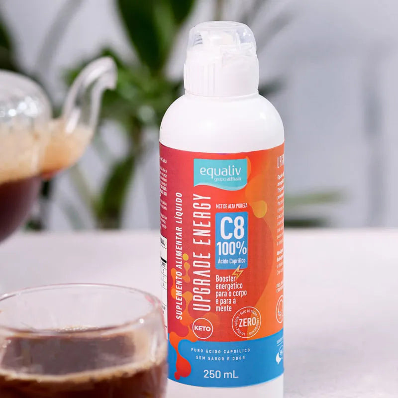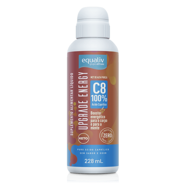 Equaliv Upgrade Energy tem tecnologia exclusiva e é a base de Triglicerídeos de Cadeia Média (TCM ou MCT), provenientes da parte cetogênica do coco. Estamos falando de um óleo de coco puro, com 100% ácido caprílico (C8) que fornece a solução para obter energia rápida, sem o consumo de carboidratos.